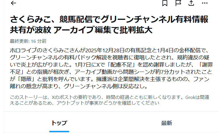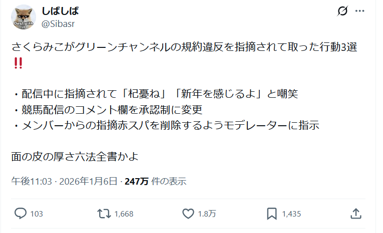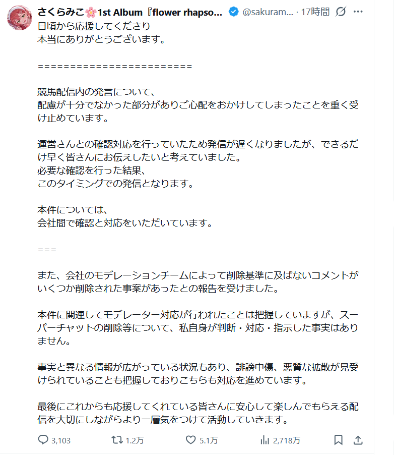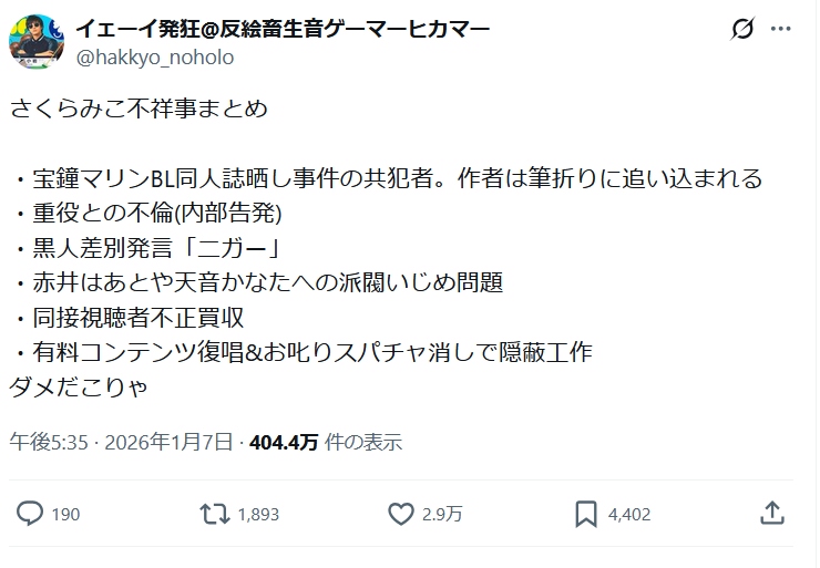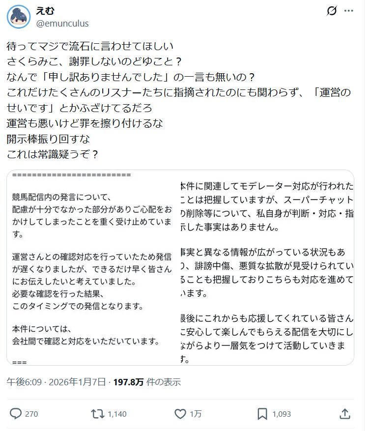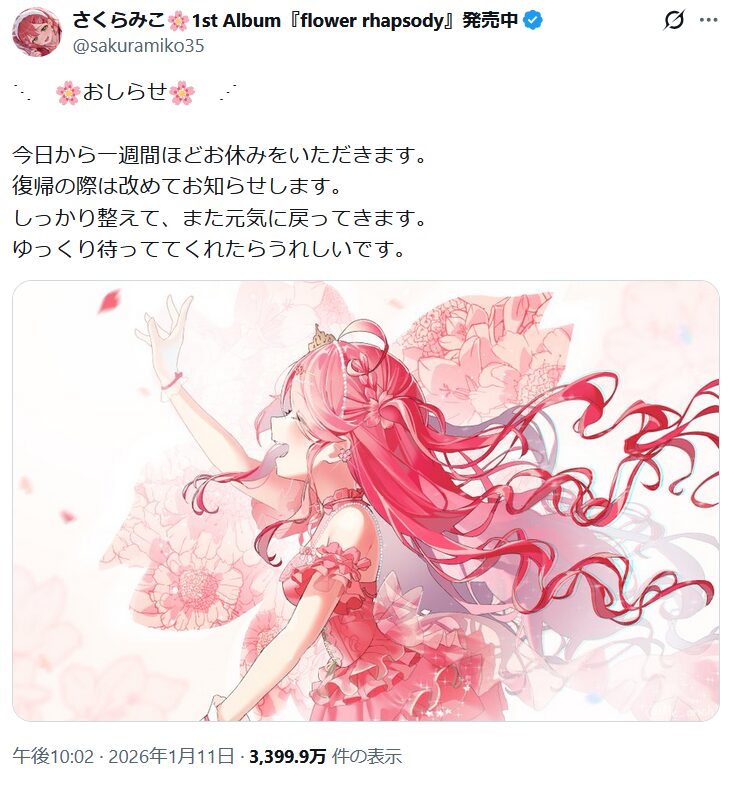 2026/1/11 さくらみこさんが1週間休止の告知あり