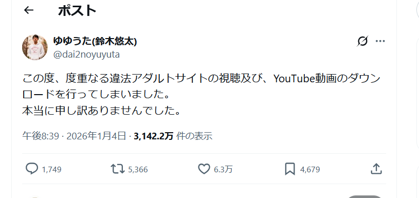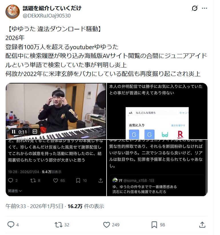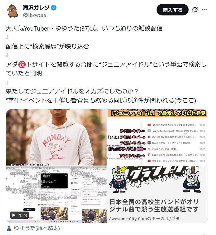 数日前よりAVの違法視聴、また検索履歴にあった内容での炎上を確認